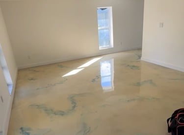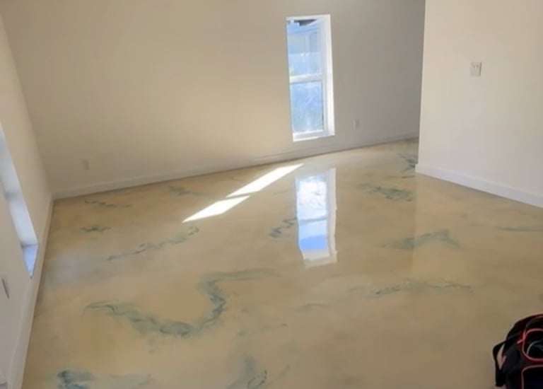 This former garage has been transformed into a stunning, modern living space designed for both comfort and style. The smooth, polished epoxy flooring boasts a glossy finish with elegant dark veining, adding a touch of sophistication. Light, neutral-colored walls create an open, airy feel, while tall, narrow windows flood the room with natural sunlight, making it warm and inviting. Click the arrow for more photos.